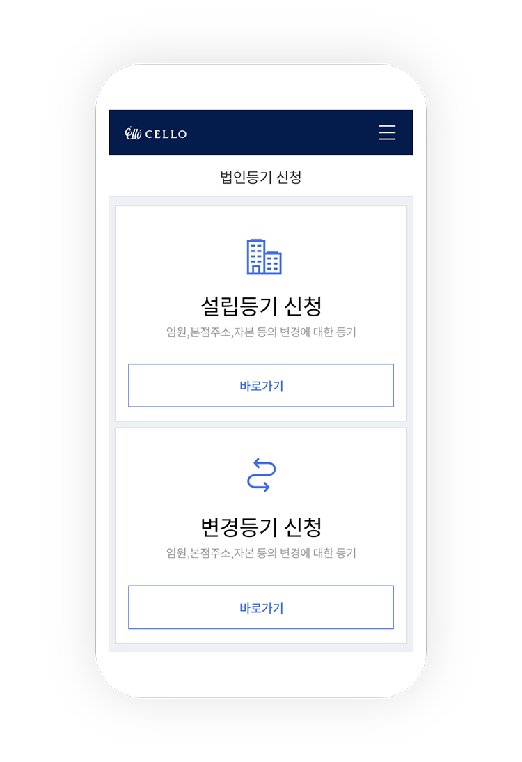 기존에 셀프등기부터 수많은 법무사무소를 다녀봤지만 첼로 법인등기만한 서비스는 어디에서도 느끼지 못한 최상의 서비스로 자신있게 추천드립니다.